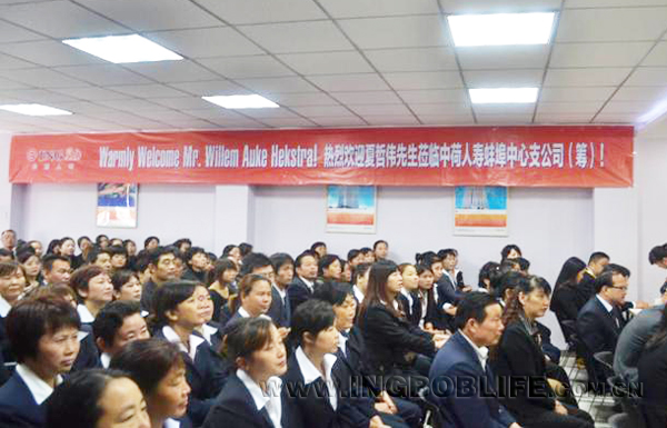 20日,夏哲伟先生与张总就在安徽分公司总经理纪海峰和副总经理李疏影的陪同下来到蚌埠中心支公司(筹)参加特别晨会。在晨会上夏哲伟先生特别向全体蚌埠 筹备的全体内外勤介绍了ING在全球以及中国市场上发展的决心和方向。ING集团是一家植根于荷兰的全球领先综合性金融服务机构,为遍布欧洲、北美、拉 美、亚洲和澳洲的逾8500万客户提供全方位的银行、投资、人寿保险以及退休服务。在中国,ING保险将合作互利作为进入中国市场的宗旨。ING保险对中 国充满信心,并把在中国长期开展业务以及与中国经济一同成长作为对中国的坚实承诺。张总也说到,看到蚌埠的伙伴他很激动,整个团队的士气和氛围非常好,他 有理由相信蚌埠在开业之后业绩会节节攀升,为此他代表总公司表示他相信蚌埠能完成总公司下达的既定目标也希望全体伙伴能取得跟好的成绩。晨会后,夏哲伟先 生、张总等领导与蚌埠筹备人员合影留念。