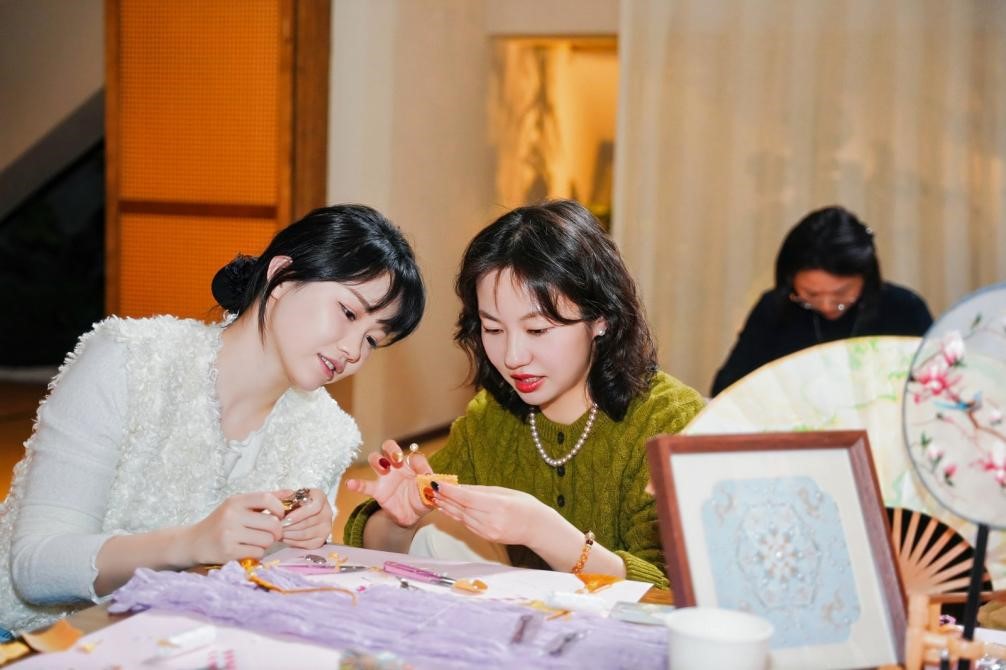 活动现场气氛轻松融洽,全员沉浸在手作的乐趣之中,专注又投入。有人低头细细勾勒花鸟虫鱼纹样,笔触轻柔细腻;有人精心搭配宋锦面料与色彩层次,一贴一粘尽显巧思;嘉宾们还时不时轻声交流制作心得,互相欣赏半成品与成品,分享创作中的小灵感与小惊喜,欢声笑语萦绕全场。