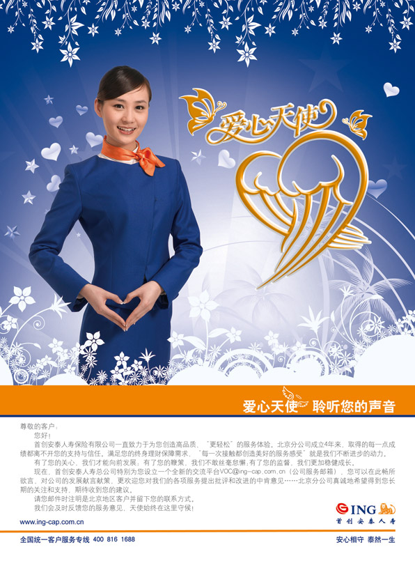 首创安泰人寿北京分公司一直致力于为客户提供终身优质的保障及服务,打造优质服务品牌。值此“爱心天使服务月”系列推广活动启动之际,公司特别推出:“爱心天使 聆听您的声音”长期服务举措,面向所有客户征询服务方面的建议和反馈,我们把客户需求当作我们努力的方向,也希望您把心目中保险公司的服务标准告诉我们。