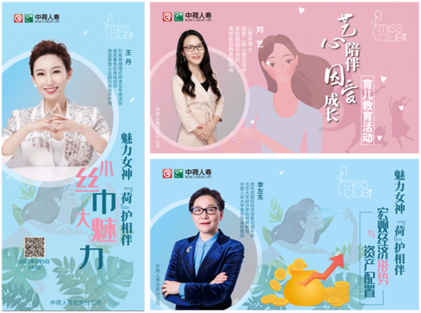 3月5日至3月24日期间,中荷人寿蜜丝会北京分会以“魅力女神,‘荷’护相伴”为主题的系列活动活力开启,“小丝巾大魅力”“艺心陪伴,因爱成长”“宏观经济形式与资产配置”三场线上直播课程全方位助力女性打造成魅力女神、智慧女性。