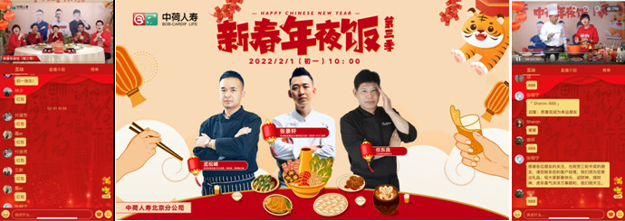 一年又一年,春节最团圆。在虎年新春假期期间,中荷人寿北京分公司开展了新春年夜饭活动,本次邀请了京城名厨任东良老师、孟松峰老师以及张景轩老师从初一至初六每天现场烹饪一道特色菜品,有北京特色菜、经典川菜、西式粤菜、创新鲁菜、地道湖北菜以及别样湘菜,为客户持续带来精彩纷呈的直播活动。