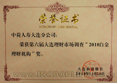 2010年11月26日,由大连新商报社主办的“2010大连白金理财机构”颁奖典礼在大连富丽华大酒店隆重举行。中荷人寿大连分公司凭借一年来的卓越 表现以及在大连市场上的良好口碑荣获第六届大连理财市场调查“2010白金理财机构”奖。中荷人寿大连分公司总经理孙继斌代表公司出席本次颁奖典礼并领取 所获奖项。