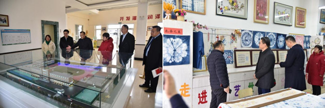 在金州区特殊教育学校陈校长的引领下,一行人参观了校园,并一同欣赏了学生们精心制作的手工作品。这些作品涵盖了色彩斑斓的扎染布艺、充满想象力的刺绣与绘画创作,还有细致入微的花卉手工艺品等,每一件都体现了孩子们的心血与独创性,展现了他们在特殊教育环境中的艺术才能和个人突破。