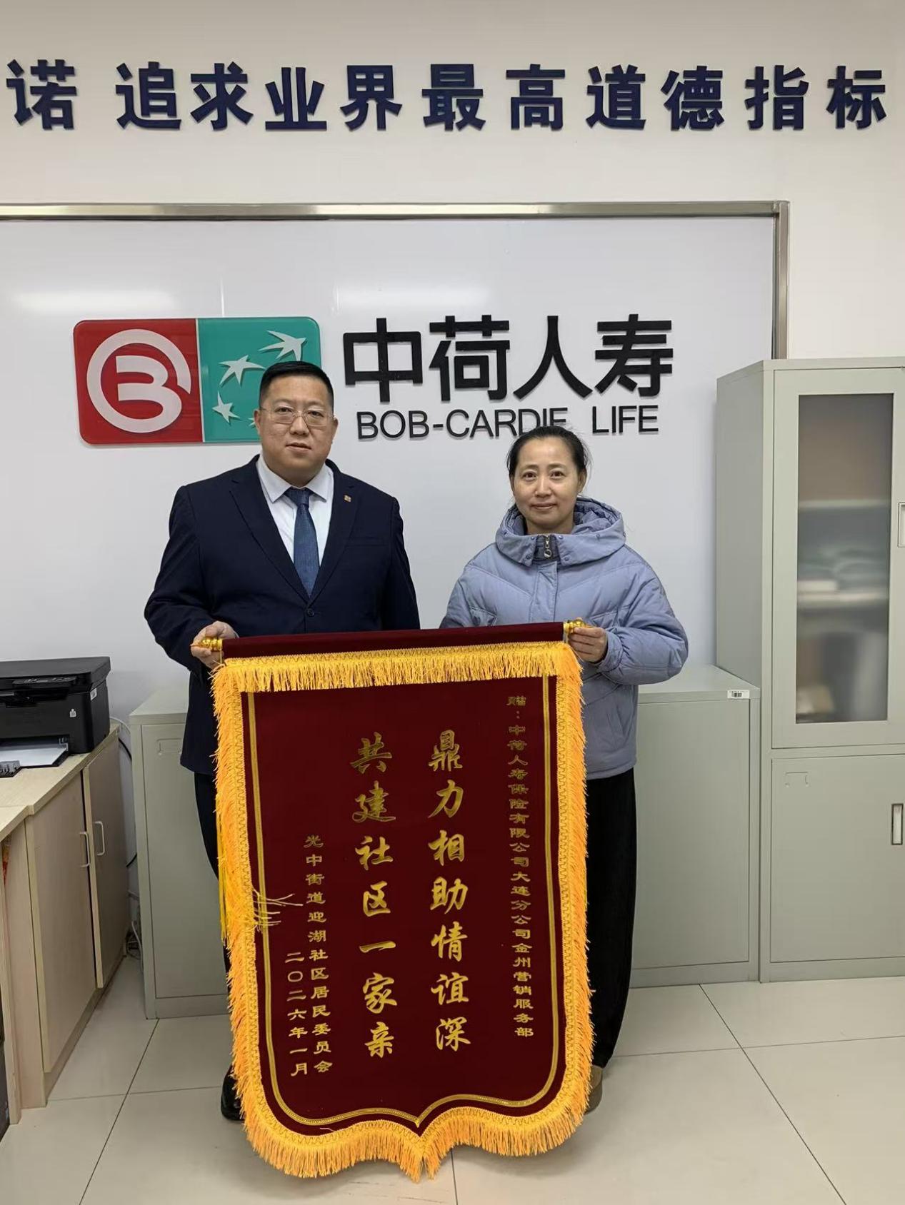 中荷人寿大连分公司始终深耕社区金融教育网格化建设,不仅建立了多家社区金融教育基地,还定期开展各类宣教活动。1月26日,金州区光中街道迎湖社区居委会候玫书记,将镌刻着“鼎力相助情谊深 共建社区一家亲”的锦旗,送到了中荷人寿金州营销服务部,以此感谢其过去一年在社区共建和金融知识普及中的突出贡献。2025年以来,分公司以金州迎湖社区金融教育基地为锚点,与周边多个社区建立联动机制,通过社区驻点咨询、反诈情景互动沙龙、老年手机课堂防诈骗等特色活动,全年累计开展宣传23场,覆盖居民超1200人次,实实在在助力社区居民守住钱袋子。