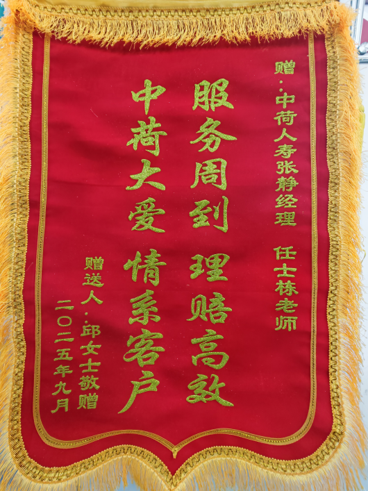 由于术后需要安心休养,加之家庭事务繁忙,邱女士在9月便制作完成的锦旗未能及时送达。直至近日,这份迟来的感谢终于抵达中荷人寿。“虽然感谢晚了,但你们的保障从来没有缺席!”邱女士的话语朴实无华,却饱含着对中荷人寿专业服务的高度认可与深深信赖。这面跨越数月的锦旗,不仅是客户心声的真挚表达,更是中荷人寿以优质服务践行保险保障使命的生动见证。