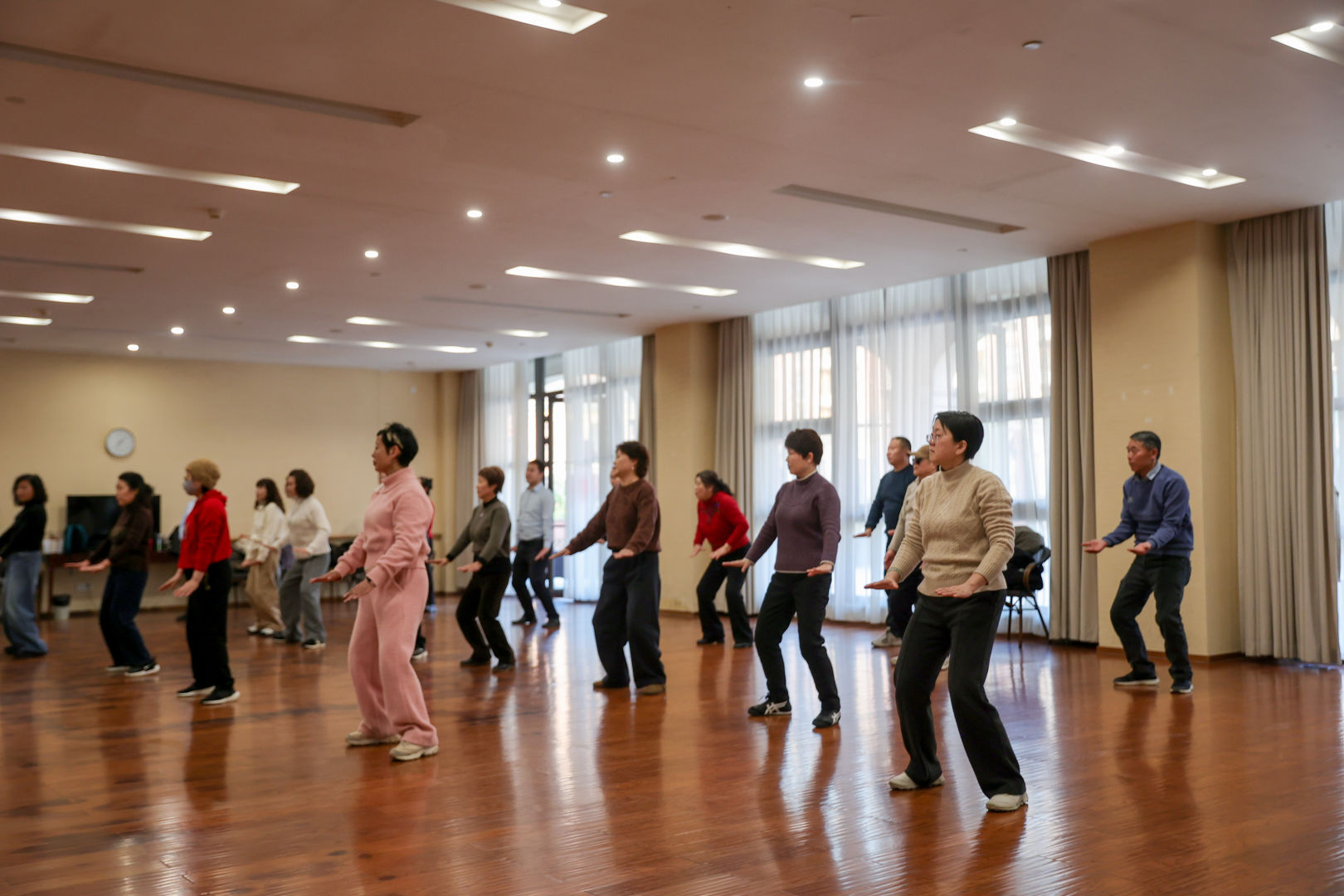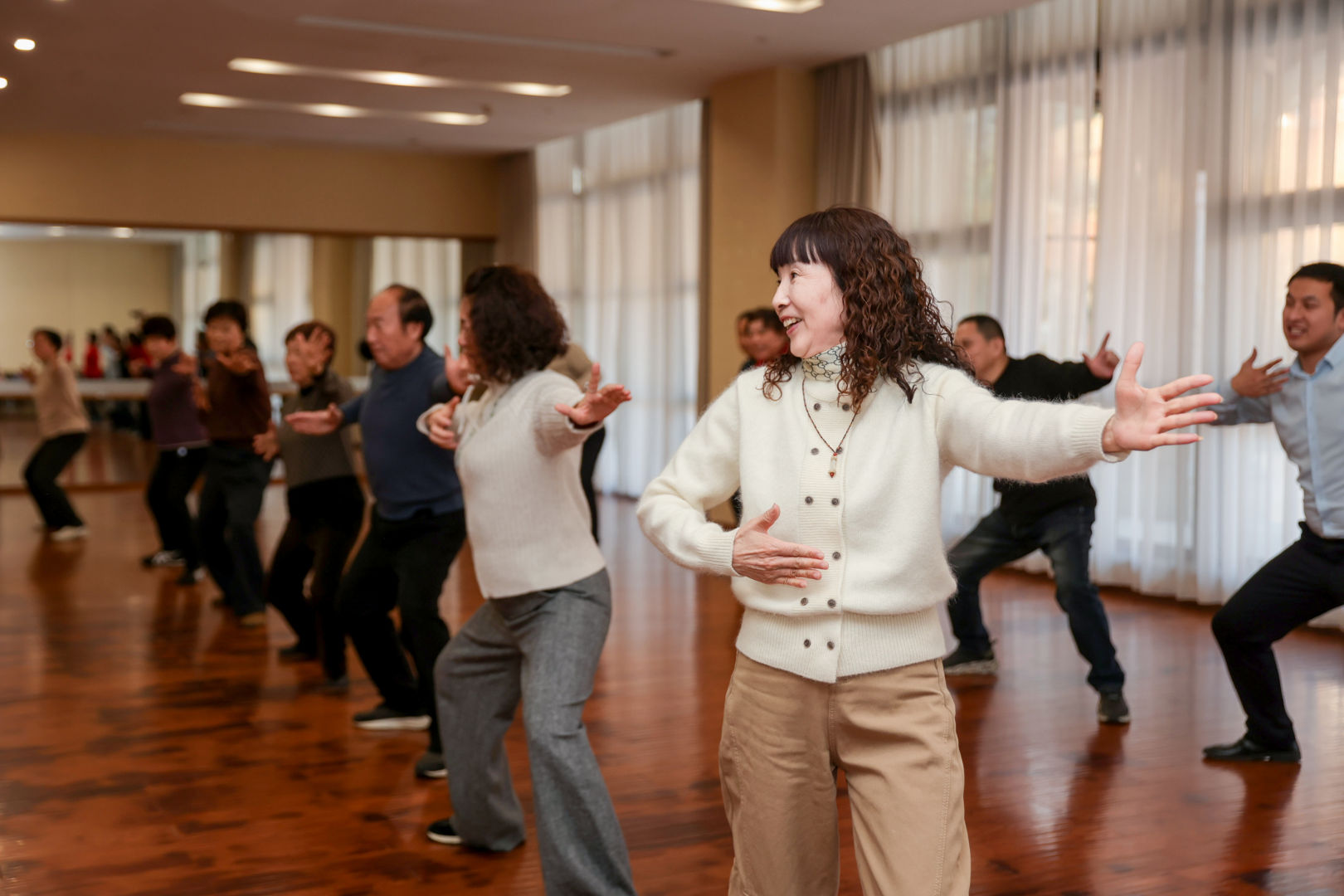 次日上午,基地的专业太极教练在舞蹈室内为嘉宾们带来一场舒缓雅致的太极教学体验。考虑到在场嘉宾的身体特点,教练特意选取了动作柔和圆活、连贯舒展的太极基础招式,从站桩调息到招式拆解,耐心细致地讲解每一个动作的要领,手把手纠正嘉宾们的姿势。嘉宾们跟随教练的节奏,在一招一式间调和气血、舒缓身心,感受太极文化的深远韵味与养生魅力。
