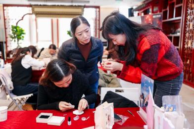 在体验环节,嘉宾们跃跃欲试,在老师的指导下,纷纷拿起螺钿片,对照着图样,细致地将螺钿片镶嵌在胸针底座上,一粘一贴、仔细调整,专注而认真。过程中,大家相互交流技巧、分享心得,遇到难题及时向老师请教,现场氛围热烈而融洽。指尖翻飞间,原本简约的胸针底座,渐渐变成了一个个精致别致、独具特色的螺钿胸针。“原来以为这些工序很简单,没想到里面藏着这么多讲究,自己亲手做下来特别有成就感。”一位参加活动的嘉宾笑着说。此次活动将非遗技艺与生活美学相结合,让嘉宾在沉浸式体验中近距离接触非遗、了解非遗,既丰富了业余生活,也增强了文化自信与民族自豪感。