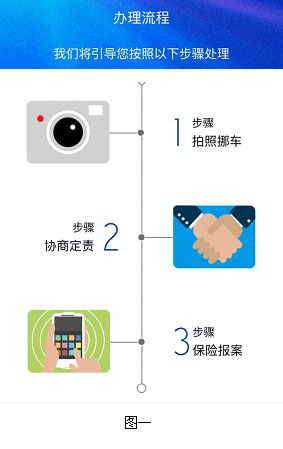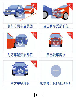 关注“快处易赔”微信公众号,点击“快处易赔”栏目,就会显示办理流程(见图一),“步骤1拍照挪车、步骤2协商定责、步骤3保险报案”。进入步骤1拍照后,首先要选择是单车事故、两车事故还是多车事故,需要注意的是,目前只能适用双车事故。随后,会出现5张样图供模仿拍摄(见图二),分别是侧前方两车全景图、自己车辆的受损部位、对方车辆受损部位、自己车辆牌照和对方车辆牌照,当然,还可以添加其他现场照片,但前面5张属于必拍照。双方都拍好照以后将车辆迅速移至不影响交通的地方,再协商定责。这时完成的是“快处易赔”的“快处”部分。