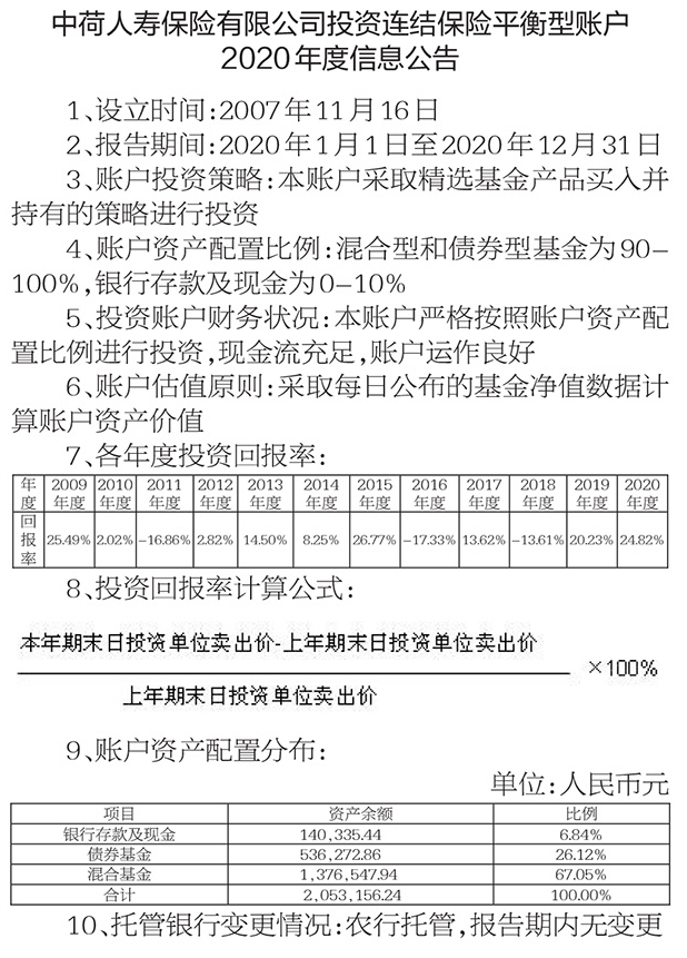 中荷人寿保险有限公司投资连结保险帐户2020年度信息公告