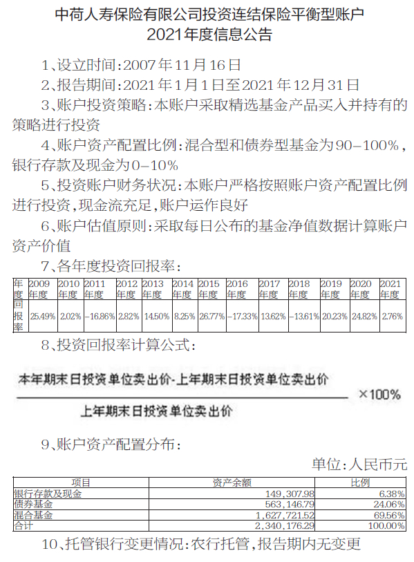 中荷人寿保险有限公司投资连结保险账户2021年度信息公告