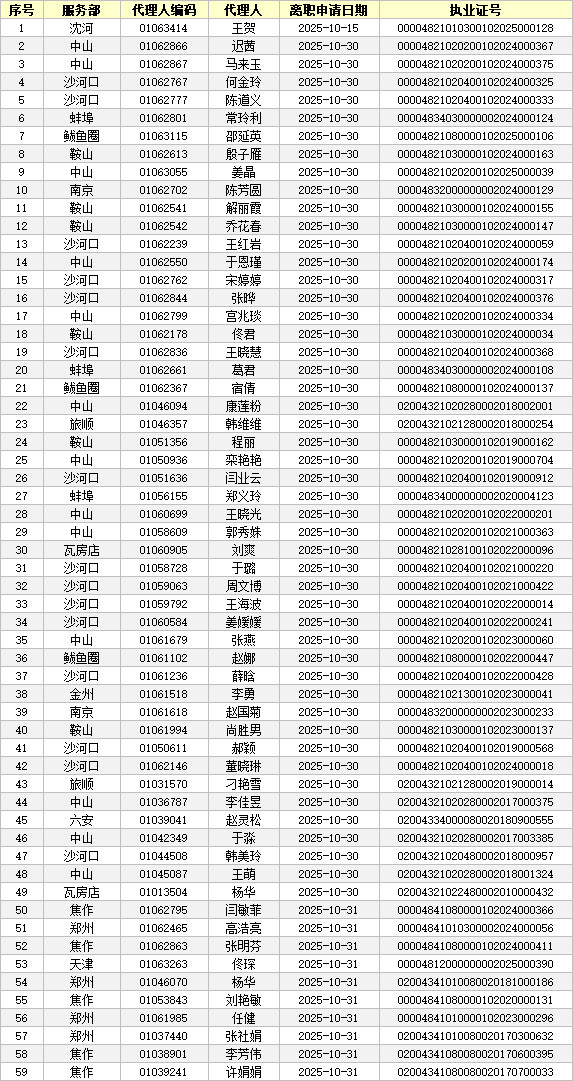 经审核确认,以下代理人已离司,其执业证书在“保险中介云平台”中已经注销或正在注销,无权从事与中荷人寿有关的个人代理业务,从离司申请日期开始,如果此执业证书与违反法律、行政法规的行为有关,中荷人寿不承担任何责任。