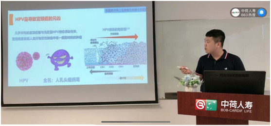 此次活动,辽宁分公司特别邀请沈阳疾控家园两癌科普宣教讲师郭海峰做客“中荷人寿”微赞直播间,为女性朋友带来宫颈癌防控知识。宫颈癌是最常见的妇科恶性肿瘤之一,99%以上的宫颈癌与HPV有关。活动中,老师首先向大家介绍了引发宫颈癌的诱因、感染过程及临床表现;随后,老师讲解了日常生活中易引发宫颈癌的几项高危因素,并结合实际案例及自身多年经验向大家讲解检查流程及康复手段。老师表示,“预防大于治疗”,宫颈癌是一种可以预防的癌症,若在早期发现,多数患者可以成功治愈,而HPV疫苗接种是预防感染的有效方法,是消除宫颈癌的第一道防线;课程最后,老师通过对HPV疫苗的种类、有效性及安全性以及不同功效进行详细讲解,让大家对于HPV疫苗有了更深入的认知。通过此次课程,有效帮助女性朋友走出宫颈癌认知误区,提升了大家的健康意识及宫颈癌疾病防控意识。
